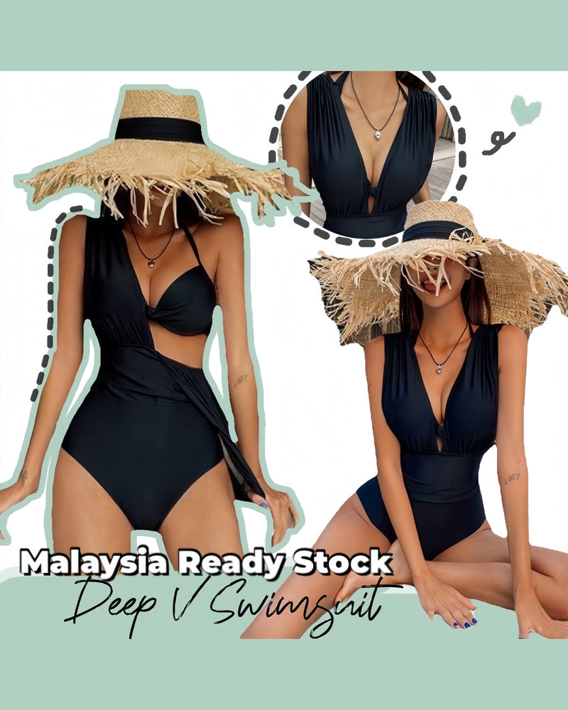 Deep Plunge Ruched Swimsuit with Halter Bra Two-Piece Set